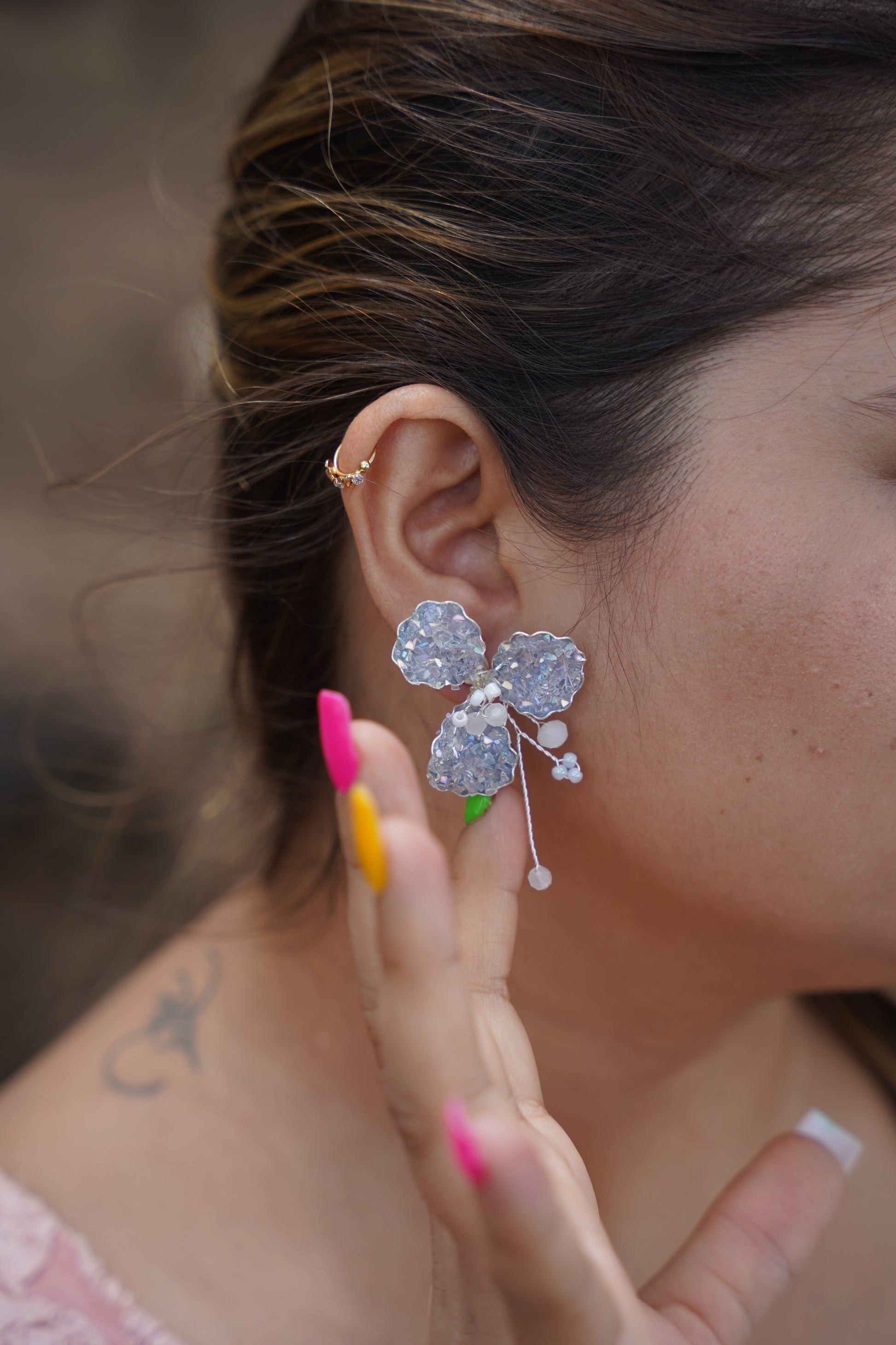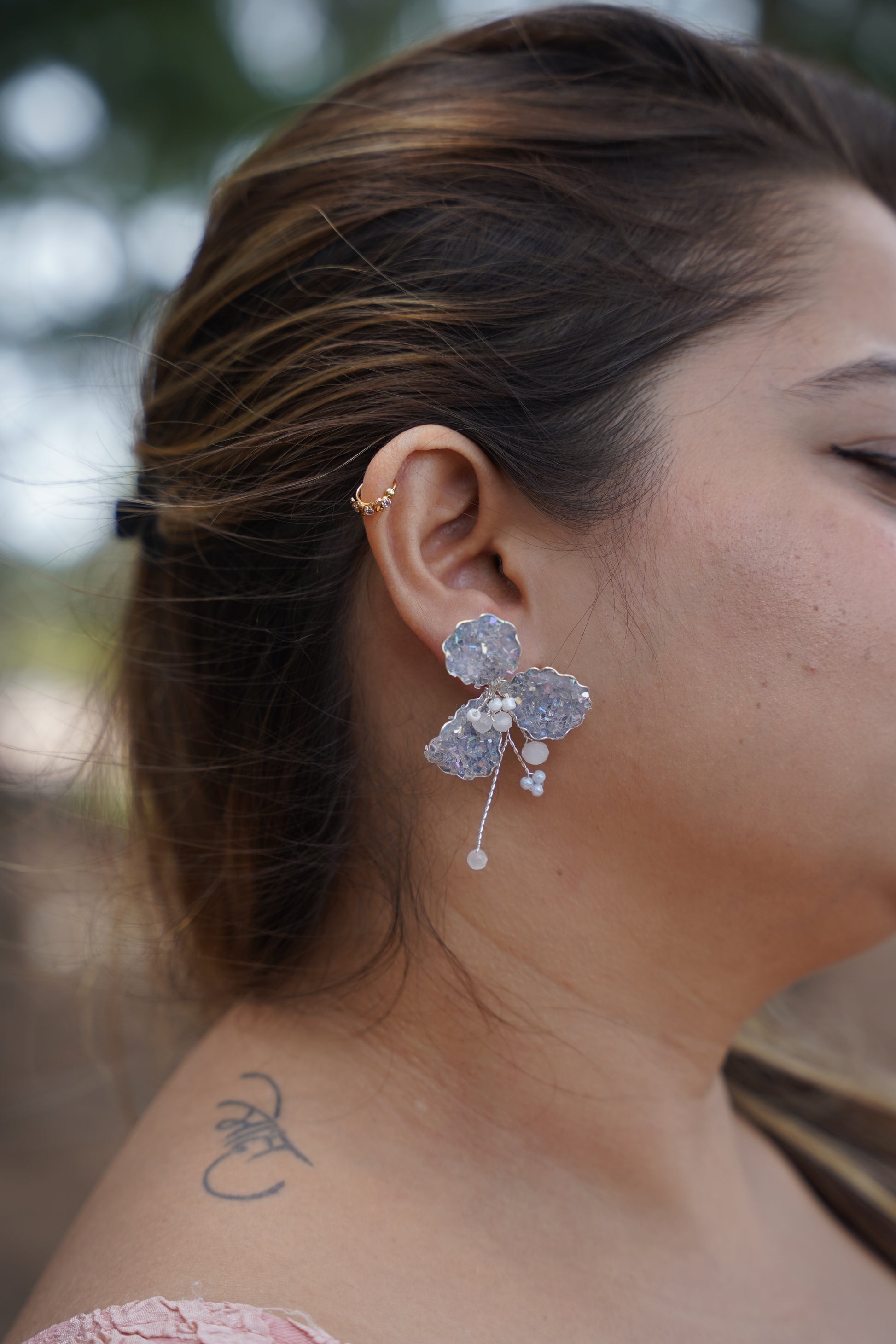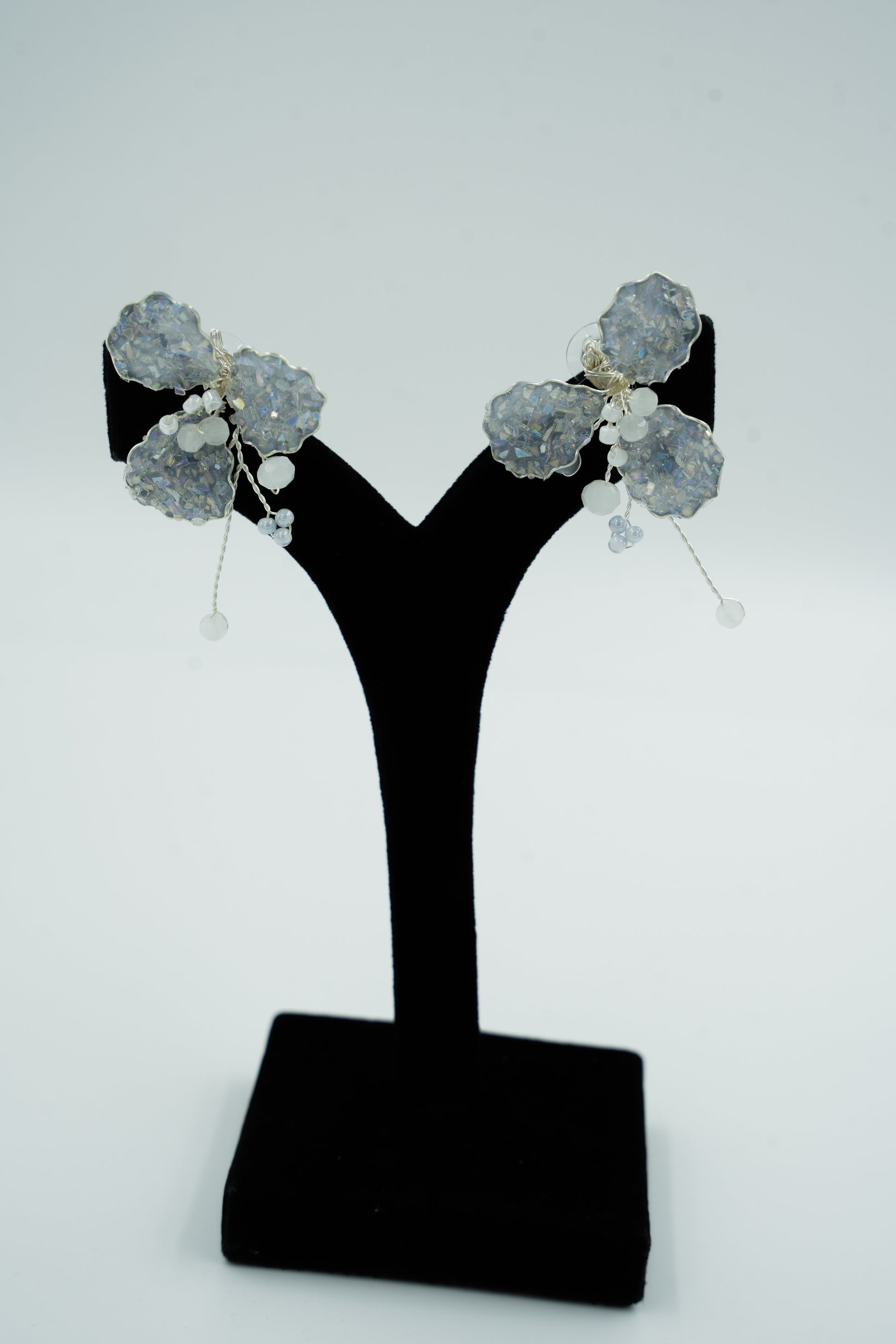 Like morning fog wrapped in moonlight, Silver Mist Sway brings an air of mystery and grace. These handmade earrings feature a delicate grey flower, adorned with sparkling stones and gentle white beads, creating a look that’s both serene and striking.